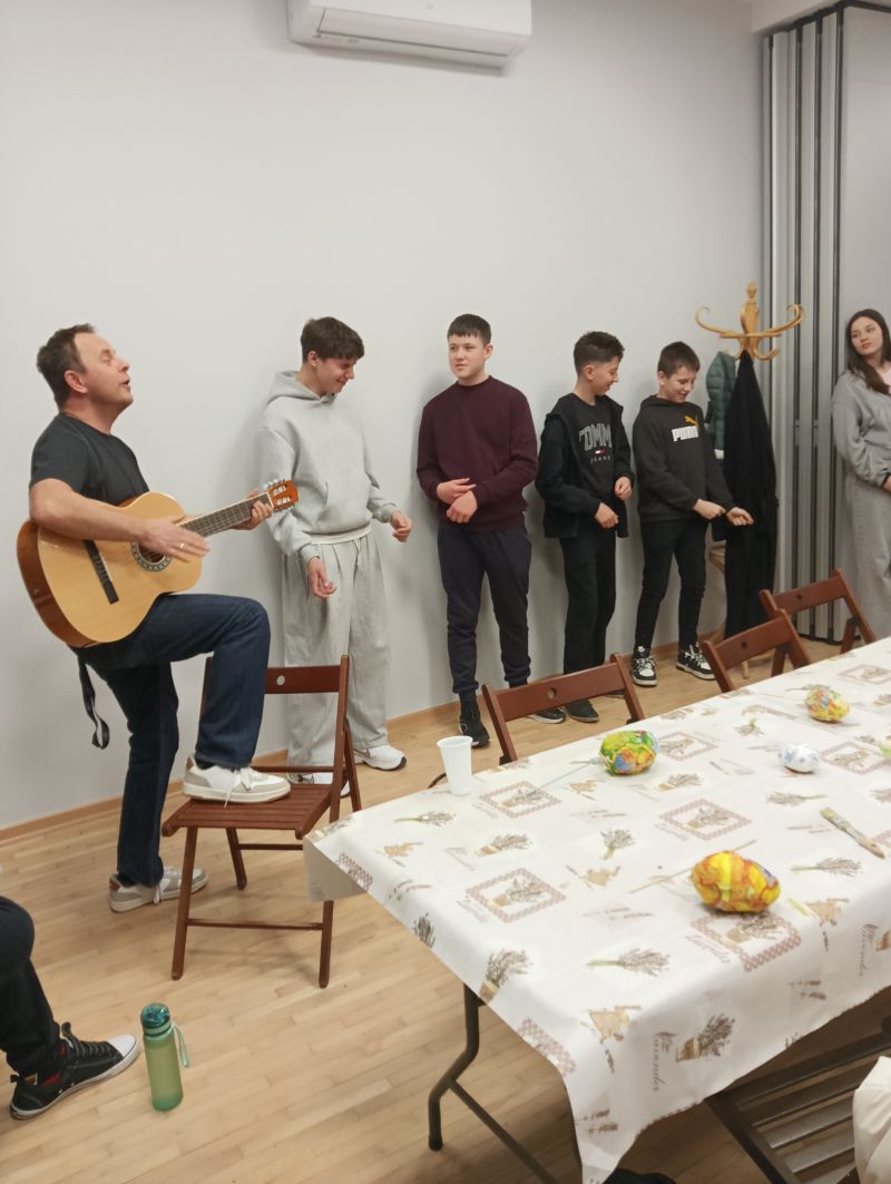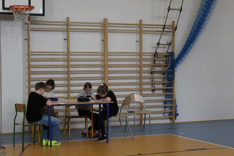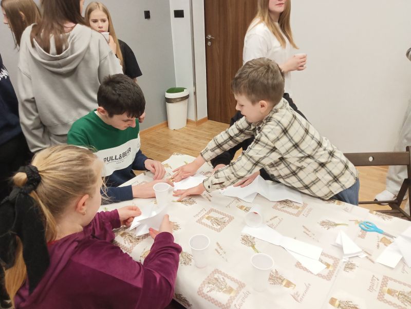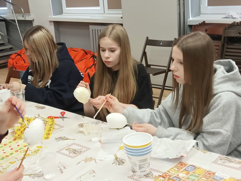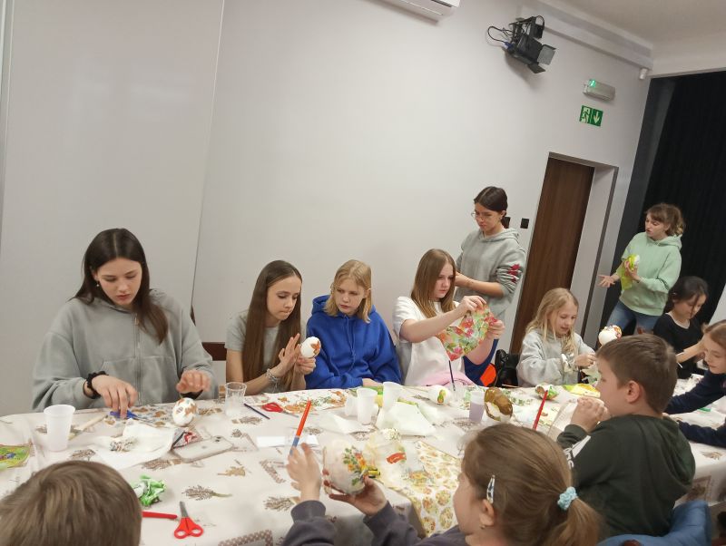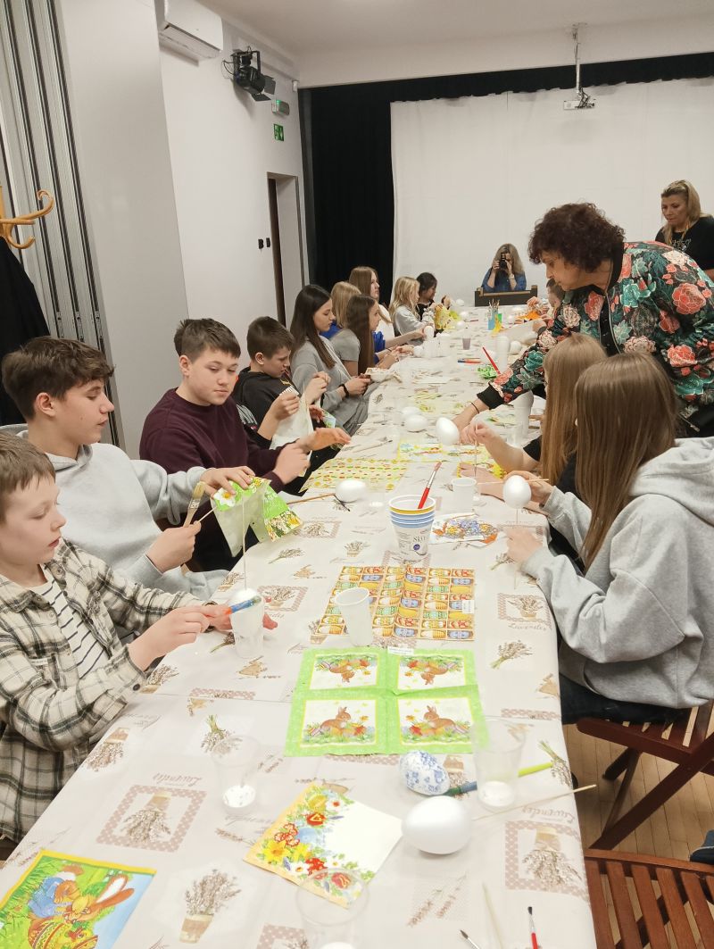 Podczas warsztatów dzieci wykonywały stroiki wielkanocne – ozdobne jajo szkieletowe z zającem. Uczniowie samodzielnie składali przygotowane elementy oraz ozdabiali swoje prace przy użyciu markerów, rozwijając przy tym zdolności manualne i kreatywność.