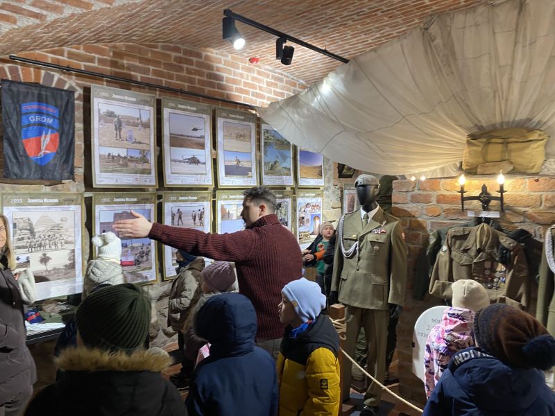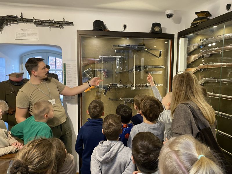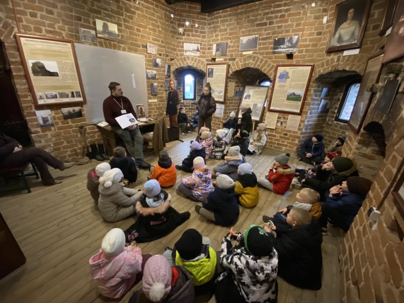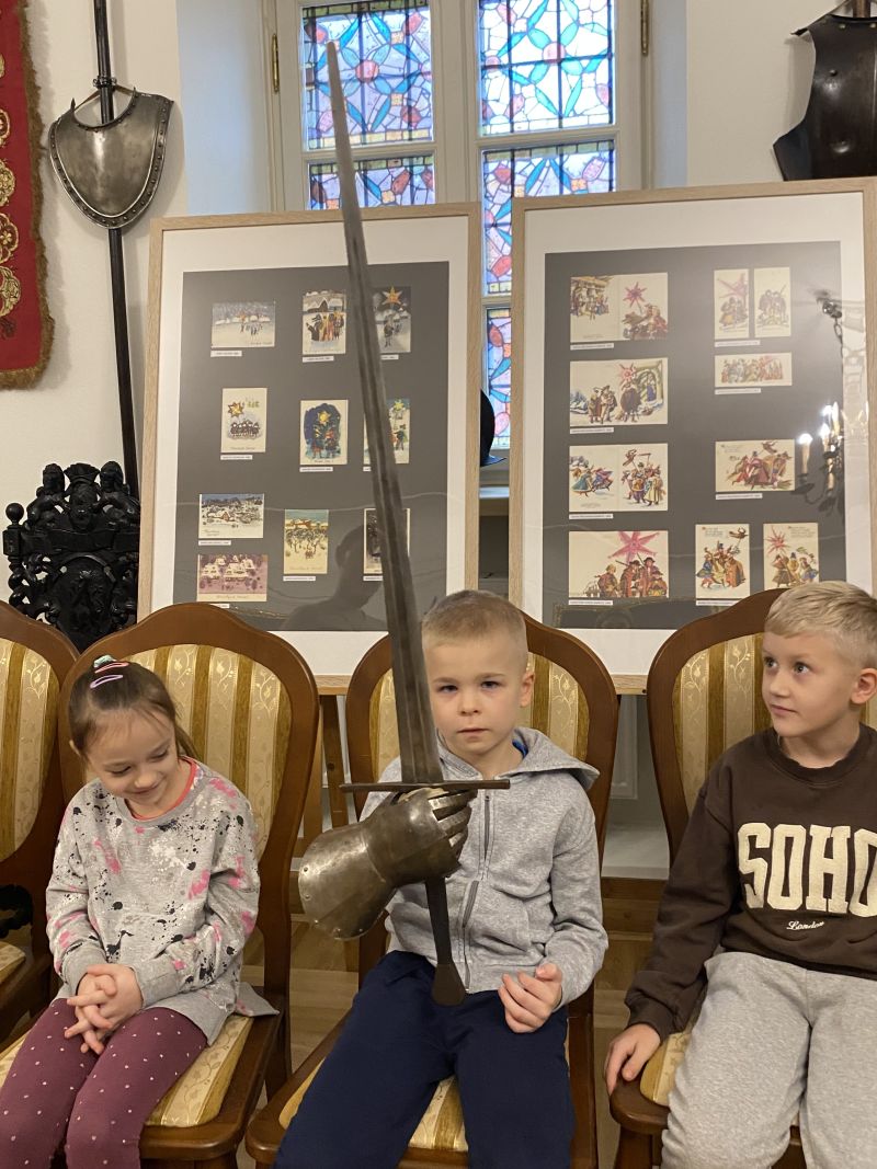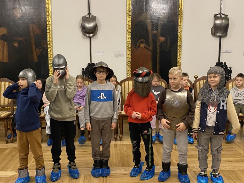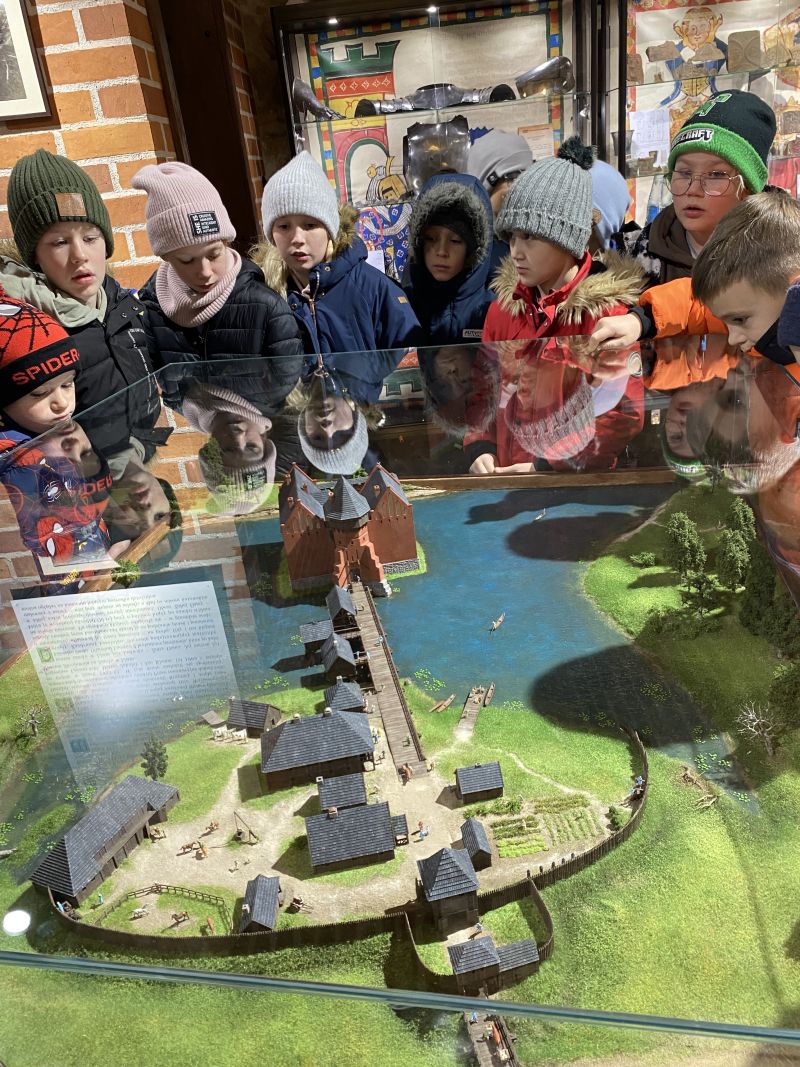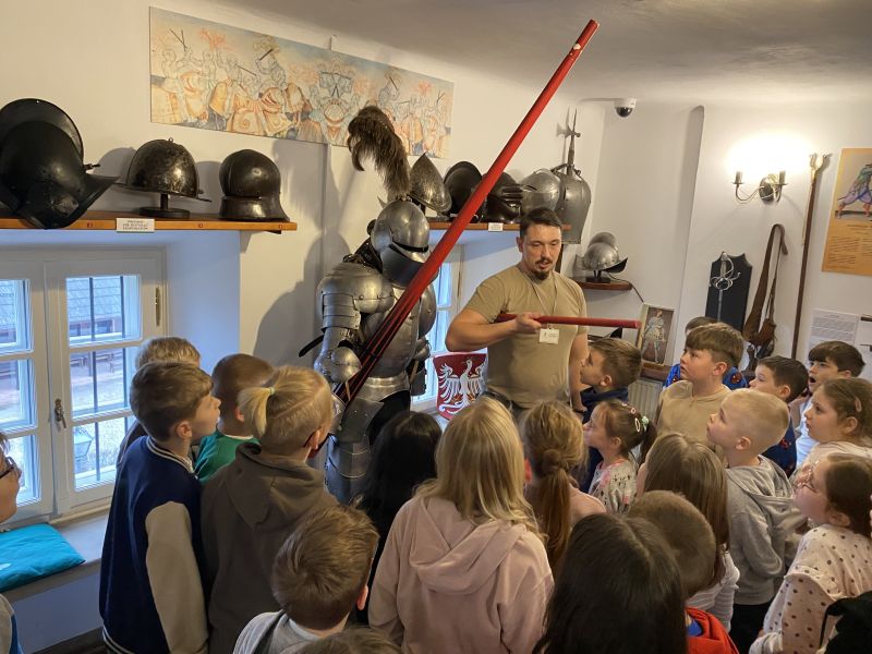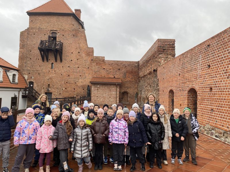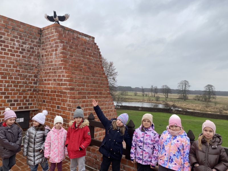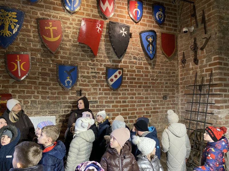 W piątek 12 grudnia 2025 r. uczniowie klas I– III wraz z wychowawczyniami uczestniczyli w wycieczce edukacyjnej do Zamku w Liwie. Wyjazd został zrealizowany i dofinansowany w ramach projektu „Kulturalna szkoła na Mazowszu”, którego celem jest rozwijanie zainteresowań kulturalnych oraz poznawanie dziedzictwa regionu. Podczas pobytu dzieci zwiedzały zamek, uczestniczyły w lekcji muzealnej pt. „Kultura rycerska”, a także miały możliwość bezpośredniego kontaktu z wybranymi eksponatami – mierzyły elementy zbroi i poznawały ich przeznaczenie. Uczniowie zapoznali się również z legendą o Żółtej Damie, zwiedzili zbrojownię oraz wspięli się na wieżę zamkową, skąd rozciągała się panorama na rzekę Liwiec. Dzieci słuchały przewodnika z dużym zainteresowaniem i aktywnie uczestniczyły w zajęciach. Wycieczka była wartościową lekcją historii w atrakcyjnej formie oraz doskonałą okazją do poznawania własnej Małej Ojczyzny.